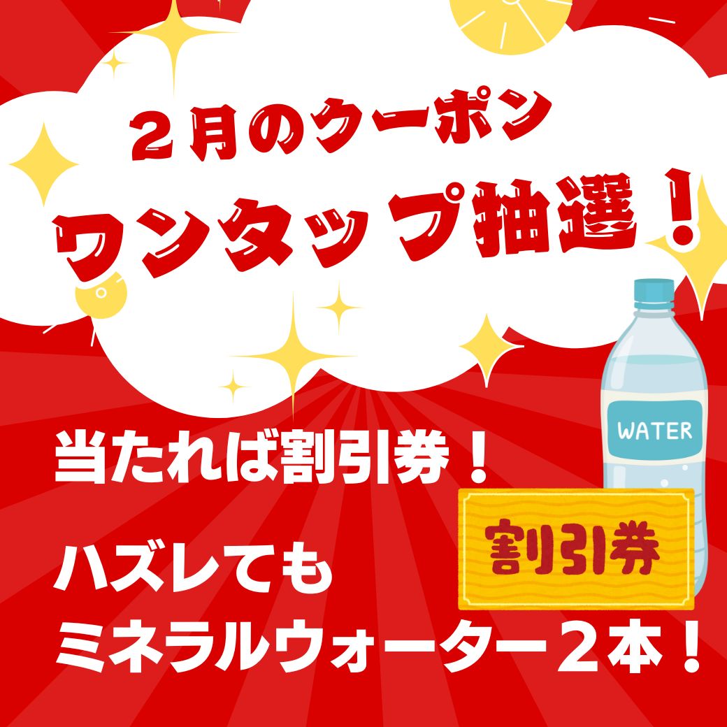 当たれば割引券、ハズレてもミネラルウォーター2本プレゼント!